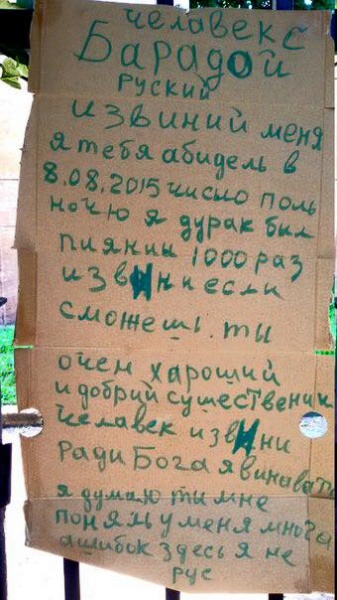 Неизвестный мужчина разместил самодельное объявление на заборе в Нижнем Новгороде, в котором попросил прощения у "человека с бородой". "Я тебя обидел ночью 8 августа. Я был пьян, извини, если сможешь", - написал раскаявшийся обидчик.