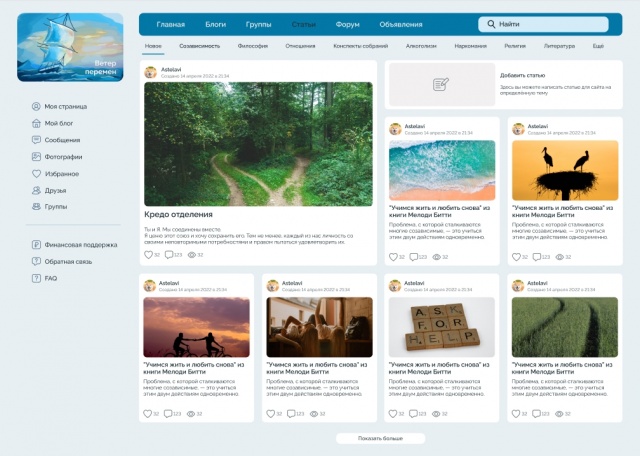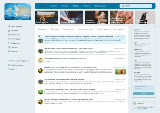 Привет славным жителям Форреста!) Надеюсь, вам понравится наш курс на обновление визуальной и частично функциональной составляющей сайта. Группа углубленного изучения программы Ал-Анон (Москва, Сочи, Ишим) проявила инициативу по плану обновления Форреста. После обновления так же планируется всерьёз подойти и к рекламе, продвижению. Поэтому, возможно, наш сайт будет не только свежее, но и живее. Я сейчас приведу примеры нескольких страниц нового дизайна: На самом деле многое останется на своих местах, что бы было удобно всем - и старым и новым пользователям. Сильно функционал не изменится. Если у кого-то есть пожелания, рекомендации, вопросы, идеи - пишите сюда или мне в личку. Естественно, изменения не бесплатны, нам насчитали приличную сумму - 24600 (предварительно, в процессе может немного увеличиться ещё). Большую часть (20080) уже насобирала вышеуказанная группа Ал-Анон. Но если у кого-то есть желание поучаствовать, конечно это приветствуется.