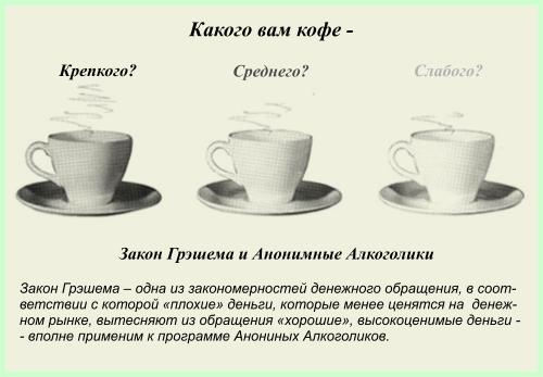 Закон Грэшема – одна из закономерностей денежного обращения, в соответствии с которой «плохие» деньги, которые менее ценятся на денежном рынке, вытесняют из обращения «хорошие», высокоценимые деньги – вполне применим к истории 12-шаговой Программы. Слабое применение на практике Программы имеет тенденцию вытеснять сильную работу по Шагам.